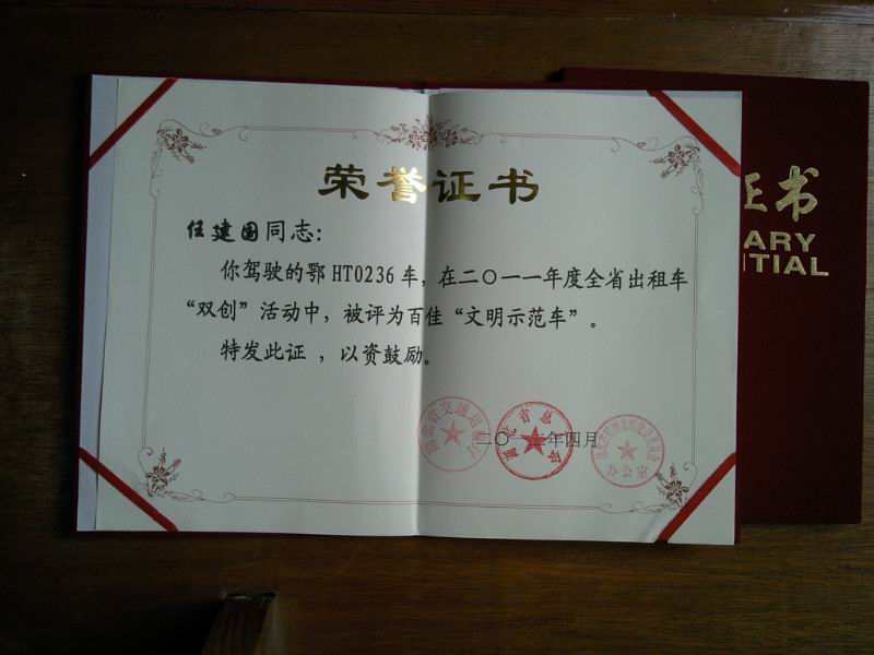 在創(chuàng)建和諧勞動(dòng)關(guān)系活動(dòng)中,荊門市公交出租汽車有限公司充分發(fā)揮和調(diào)動(dòng)廣大駕駛員的勞動(dòng)熱情和創(chuàng)造活力,獲得了一系列可喜成績(jī)。雷鋒車隊(duì)隊(duì)長(zhǎng)曾凡華,2011年獲得省雙創(chuàng)“文明示范車”、荊門市出租行業(yè)“服務(wù)先鋒號(hào)”;2012年獲得荊門市“十佳的哥”榮譽(yù)稱號(hào);前任隊(duì)長(zhǎng)王建春獲得省交通廳“優(yōu)秀班組長(zhǎng)”榮譽(yù)稱號(hào);隊(duì)員任建國(guó)獲省交通廳“文明示范車”先進(jìn)個(gè)人稱號(hào)。2013年6月,公司雷鋒車隊(duì)獲“全國(guó)工人先鋒號(hào)”榮譽(yù)。2014年2月28日,公司鄂HT1223雷鋒車駕駛員張華維獲省精神文明建設(shè)委員會(huì)辦公室、省交通運(yùn)輸廳“雷鋒號(hào)”榮譽(yù)標(biāo)牌。雷鋒車隊(duì)先后涌現(xiàn)出一批優(yōu)秀駕駛員,分別獲得了荊門出租汽車行業(yè)“服務(wù)先鋒號(hào)”、“十佳的哥的姐”等稱號(hào)及“荊門市道德模范提名獎(jiǎng)”、“荊門市見(jiàn)義勇為先進(jìn)集體”。