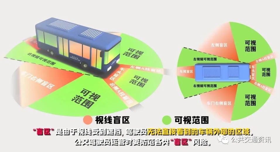“盲區(qū)”是由于視線受到遮擋,駕駛員無法直接看到的車輛外部的區(qū)域。公交駕駛員運營時要防范各類“盲區(qū)”風險。