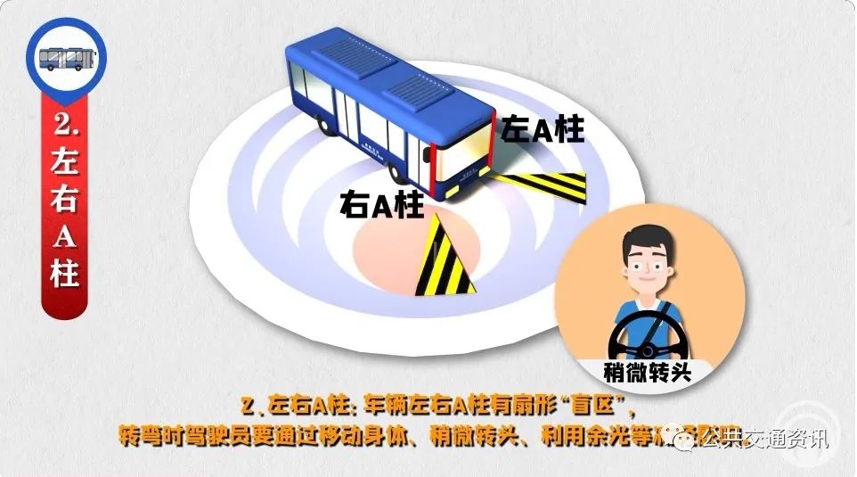 2、左右A柱:車輛左右A柱有扇形“盲區(qū)”,轉彎時駕駛員要通過移動身體、稍微轉頭、利用余光等減輕影響。