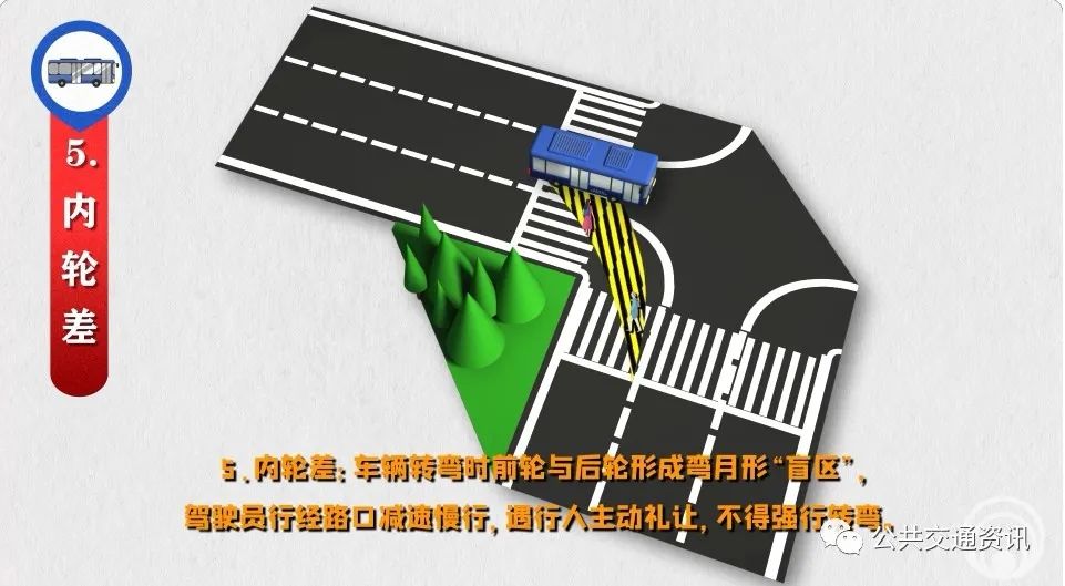 5、內輪差:車輛轉彎時前輪與后輪形成彎月形“盲區(qū)”,駕駛員行經路口減速慢行,遇行人主動禮讓,不得強行轉彎。
