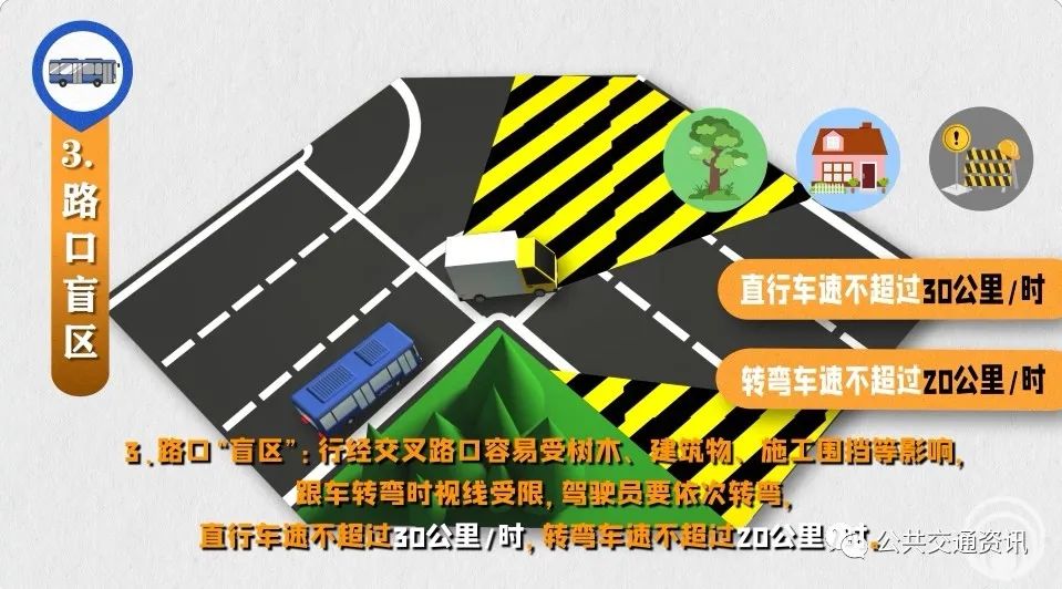 3、路口“盲區(qū)”:行經交叉路口容易受樹木、建筑物、施工圍擋等影響,跟車轉彎時視線受限,駕駛員要依次轉彎,直行車速不超過30公里/時,轉彎車速不超過20公里/時。