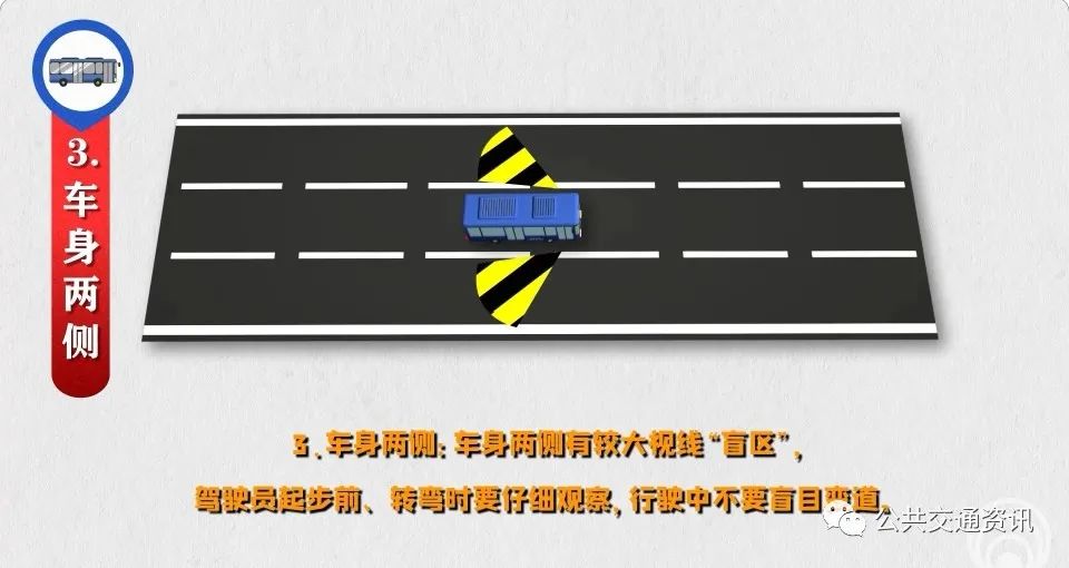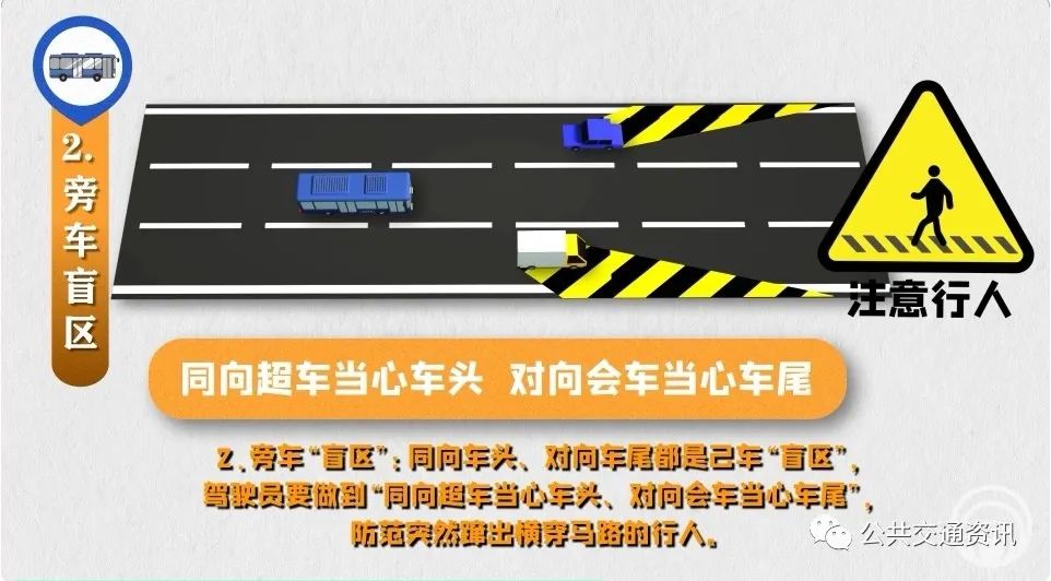 2、旁車“盲區(qū)”:同向車頭、對向車尾都是己車“盲區(qū)”,駕駛員要做到“同向超車當心車頭、對向會車當心車尾”,防范突然躥出橫穿馬路的行人。