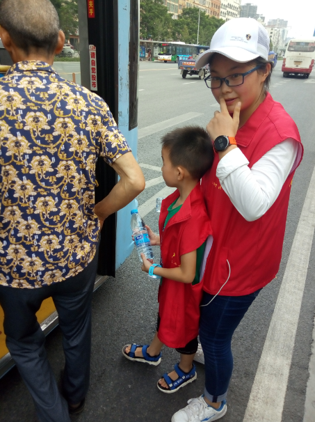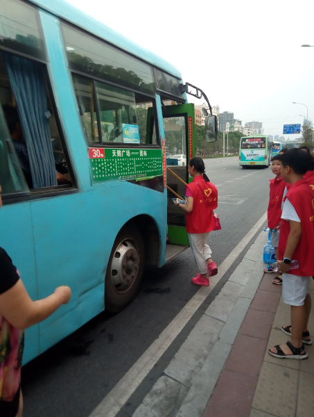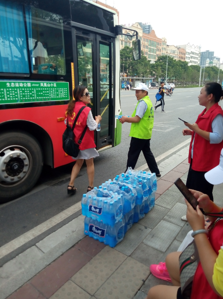 15時許,志愿者們已經(jīng)布置好了送水點,將箱礦泉水?dāng)[在了站臺旁邊。每有一輛公交車進站???,志愿者們都會給駕駛員們遞上兩瓶礦泉水,還有一些放暑假的小朋友們,也熱情的加入到此次活動,充當(dāng)著志愿主力軍,用他們的行動清涼了公交駕駛員的心,傳播著社會正能量。