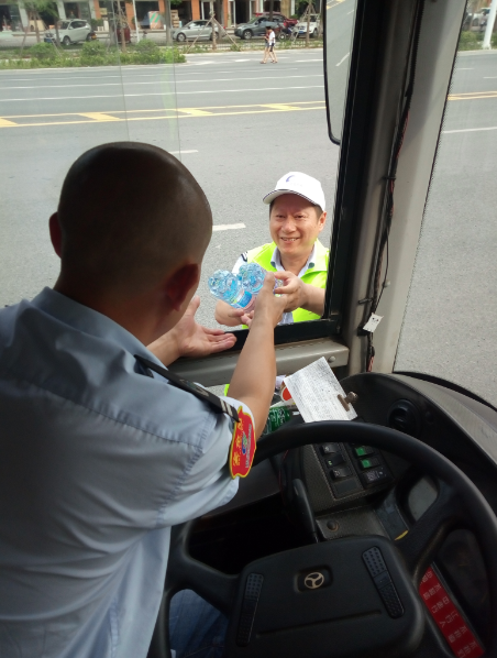 “目前還有小部分線路的公交車是沒有空調(diào)的,就算夏天再熱也得堅持,現(xiàn)在天這么熱,一天下來衣服都不知道要濕多少次。今天有他們給我們送來的礦泉水,讓我們司機在這夏日里體會到了一絲清涼,真的很感謝他們。有了他們的支持和理解,我們更要做好本職工作?!惫患瘓F工作人員說。