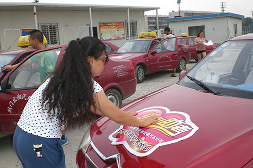圖5為工作人員為愛心助考車粘貼活動標(biāo)識